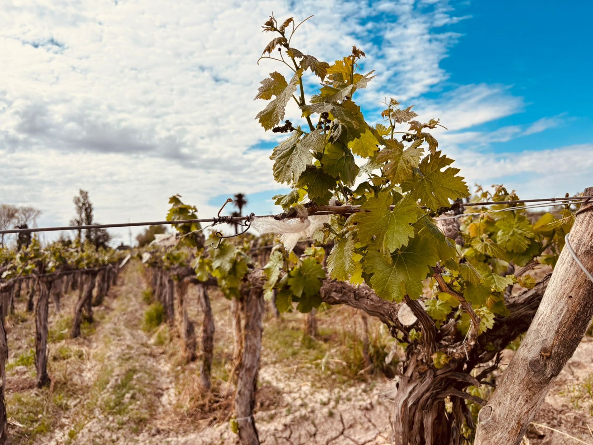 En esta finca se encuentran variedades como Bonarda, Cabernet Franc, Cabernet Sauvignon, Cereza, Chardonnay, Moscato de Alejandría y Syrah. Con conducción en parral y espaldera, irrigación por goteo y maniobras técnicas cuidadas, buscamos equilibrio varietal y expresión.